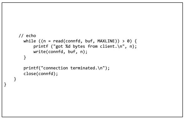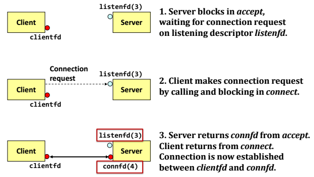 - 즉 listen() 함수에 지정한 descriptor가 위 그림에서의 listenfd (Listening descriptor), accept() 함수의 결과로 새롭게 생성되어 return된 descriptor가 connfd (Connection descriptor)가 된다!