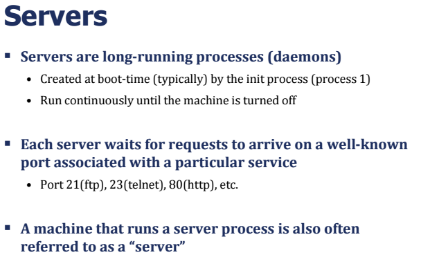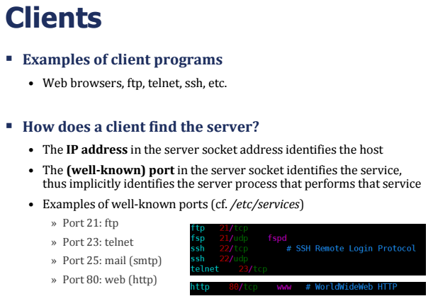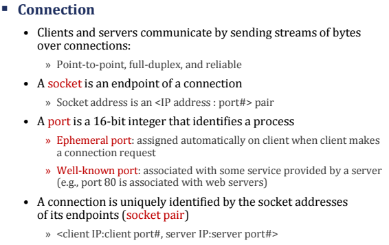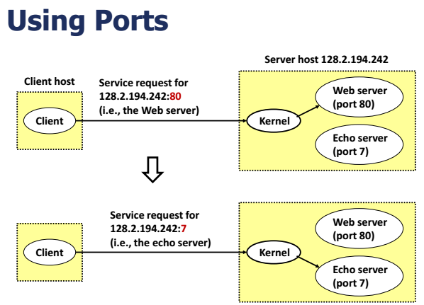 - 위 그림에서 동일한 IP 주소(128.2.194.242)를 통해 Server Host에 접근하지만, 사용하고자 하는 Service에 따라 Port번호를 달리하여 (80은 웹 서버, 7은 에코 서버) 사용한다!