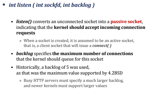 - 지정한 descripter는 listening socket이 되고, backlog만큼의 큐 공간을 갖게 된다 (즉 backlog 만큼의 Client 연결 요청을 받을 수 있다).