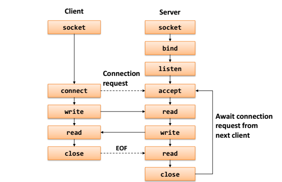 - 서버 : 소켓을 생성, 주소 할당, 연결 요청 기다림, 요청에 대한 응답