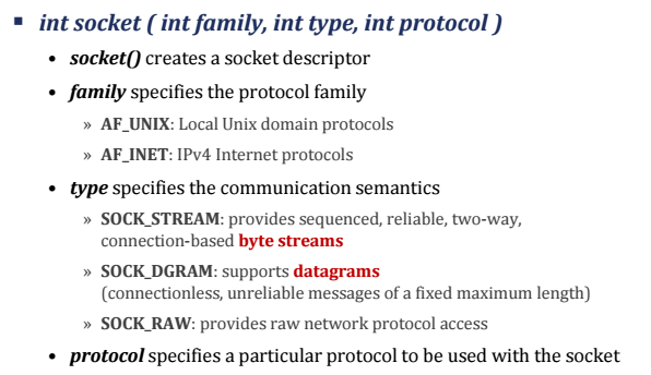 #include <sys/types.h> #include <sys/socket.h> int socket(int domain, int type, int protocol); * domain : 소켓 종류 (유닉스 도메인 또는 인터넷 소켓) * type : 통신 방식 (TCP or UDP) * protocol : 소켓에 이용할 프로토콜- domain에는 유닉스 도메인 소켓을 생성할 경우 AF_UNIX를 지정하고, 인터넷 소켓을 생성할 경우 AF_INET을 지정