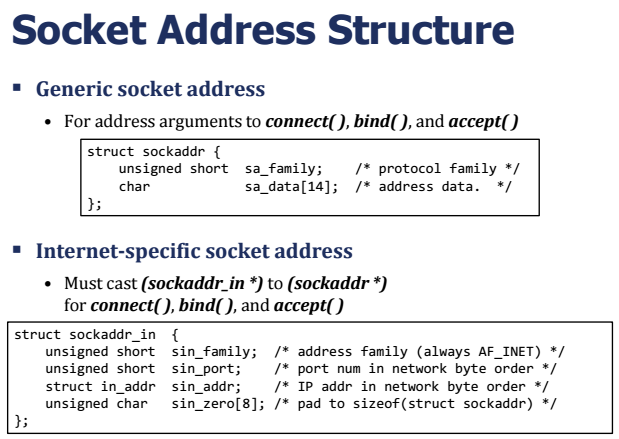 - 소켓 구조체는 유닉스 도메인 소켓과 인터넷 소켓에서 다른 형태를 사용한다