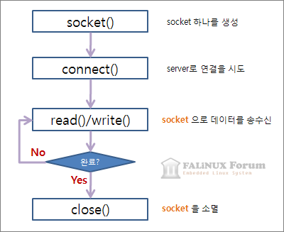 - 클라이언트 : 소켓을 생성, 주소 할당, 연결 요청