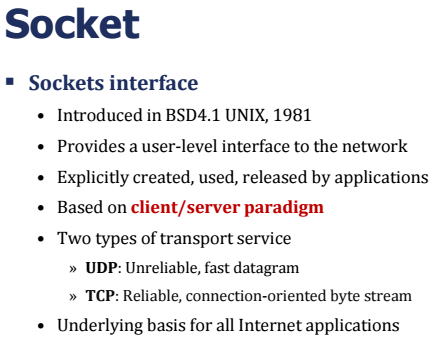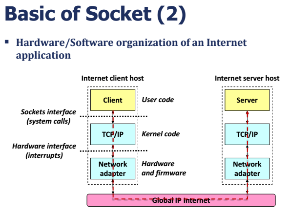 : 이런 복잡한 작업을 간편하게 해주는 것이 Socket Interface이다. 소켓 인터페이스는 응용 계층에서 전송 계층의 기능을 사용할 수 있도록 제공하는 응용 프로그래밍 인터페이스 (API, Application Programming Interface)이다.