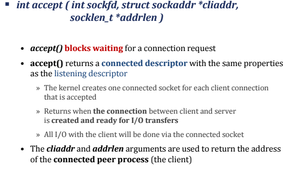 - accept의 반환값은 성공/실패에 대한 정수값이 아닌, 새로운 디스크립터 번호, 즉 새로 생성받은 Connected Socket! (위 그림에서는 Server 쪽의 Client Socket, Client 쪽의 Client Socket 아님)