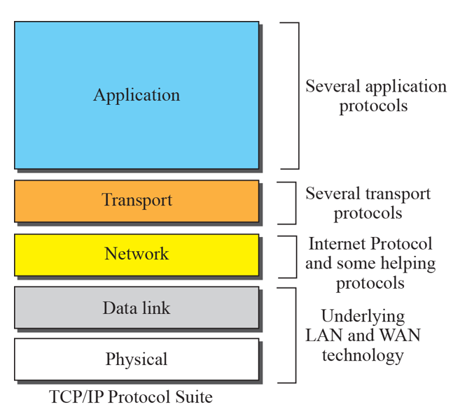 이 중 인터넷 표준 프로토콜인 TCP/IP 계층은 크게 5계층(하드웨어 계층과 네트워크 접속계층을 묶어서 4개로도 본다)으로 나뉘며 다음의 특징을 가지고 있다.