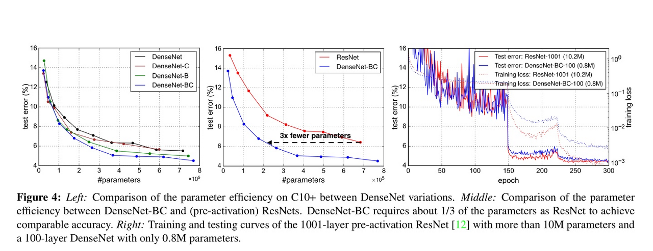 DenseNet은 Model compactness, Feature reuse면에서 탁월하고, 수많은 shortcut connection들이 deep supervision처럼 중간 layer들이 discriminative한 특징을 배우도록 강제하는 효과가 있다고 한다. 또한 stochastic depth에 대한 DenseNet만의 해석이 regularizing 효과가 있다는 것을 보여준다.