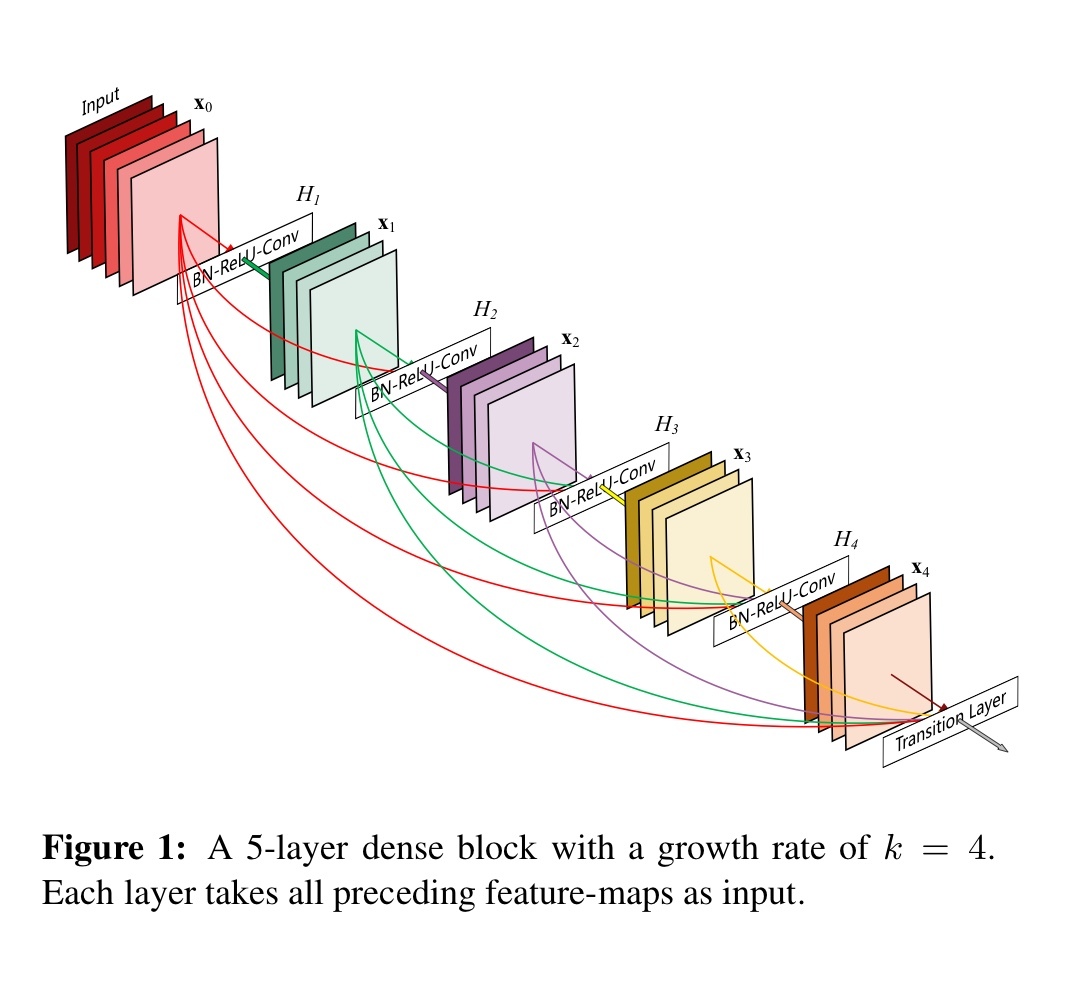 Dense Block 내의 레이어는 k개의 피쳐 맵을 생성! 이때 k = Growth rate이며 해당 논문에서는 k=12 사용!