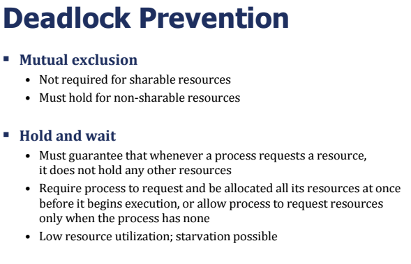 : 프로세스 실행에 필요한 모든 자원을 한꺼번에 요구하고 허용할 때까지 작업을 보류해서, 나중에 또다른 자원을 점유하기 위한 대기 조건을 성립하지 않도록 함