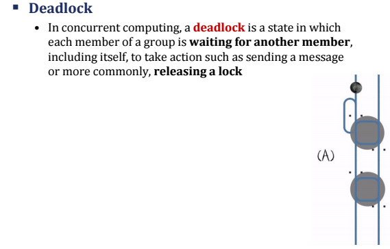 : 둘 이상의 프로세스가 다른 프로세스가 점유하고 있는 자원을 서로 기다릴 때 무한 대기에 빠지는 상황 / 교착 상태라고도 한다