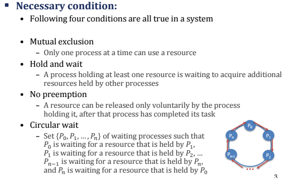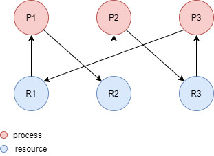 4) Circular wait (순환대기) [ 대기 프로세스의 집합이 순환 형태로 자원을 대기하고 있는 상태]