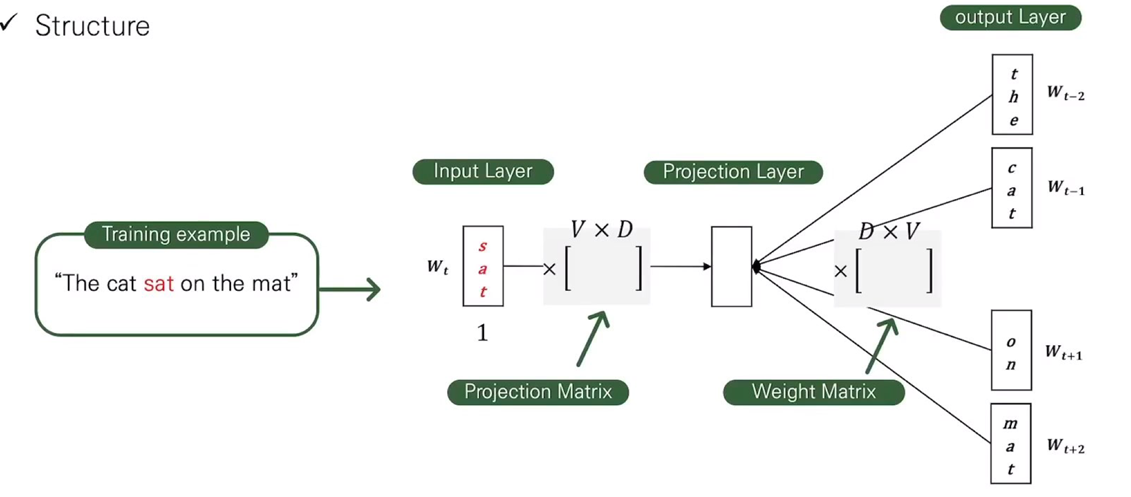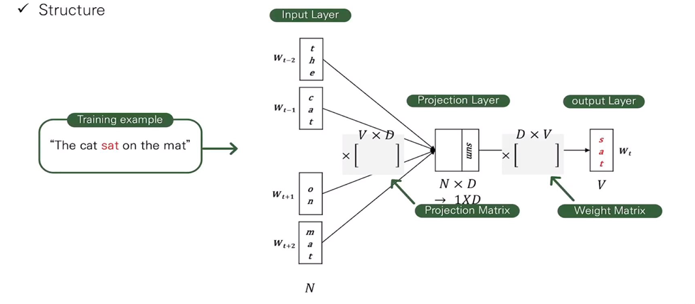 => 즉, 기준 단어를 입력으로 사용하여, 기준 단어에 대해 앞 뒤로 N/2개 씩, 총 N개의 문맥 단어를 맞추기 위한 네트워크를 만듭니다.