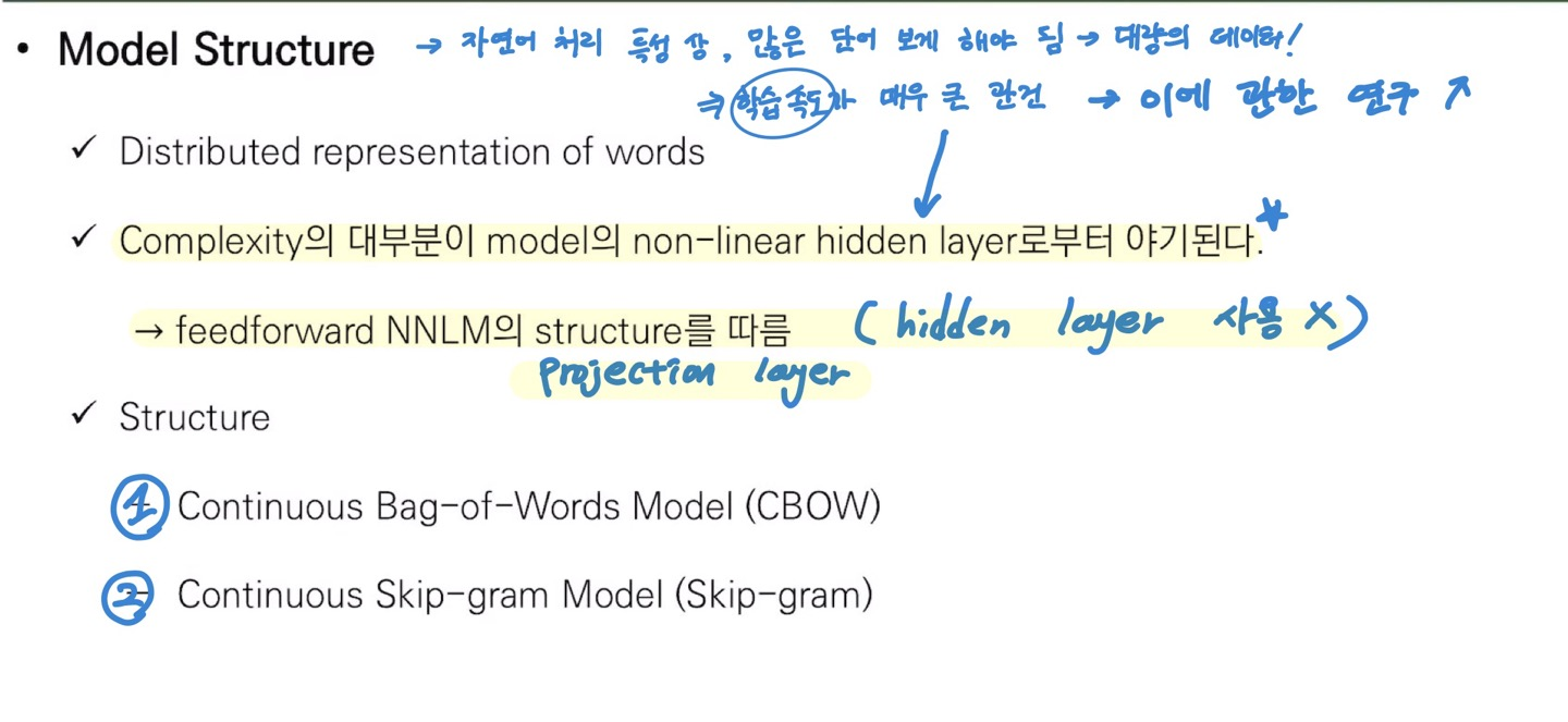 : 자연어 처리 특성상, 많은 단어를 보게 할수록 성능이 올라가는데 이는 필연적으로 대량의 데이터를 다뤄야 한다는 ㄸ뜻입니다. 따라서 학습 속도를 줄이는 것이 매우 중요한 문제가 됩니다. 그래서 Word2Vec에서는 RNNLM의 Complexity는 hidden layer에서 오기 때문에 Hidden Layer를 사용하지 않는 NNLM 구조를 사용합니다.