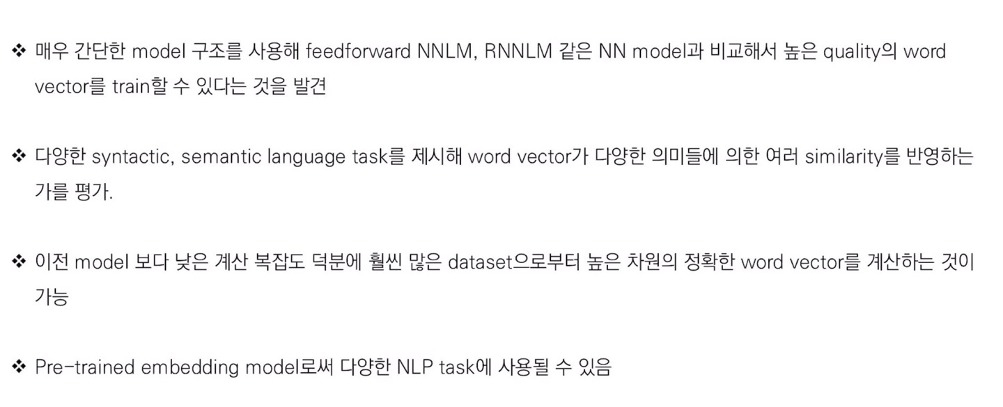 : 즉, Word2Vec 논문에서는 복잡도를 줄이면서도 높은 수준의 word vector를 학습하는 기술을 제안합니다.