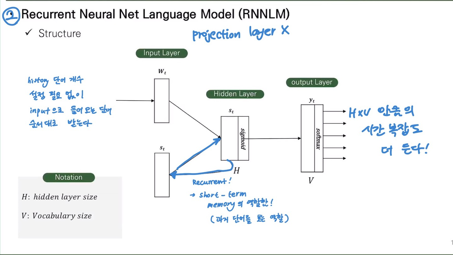 RNNLM은 projection layer 대신 hidden layer를 사용하여 과거의 단어들을 보는 short term memory의 역할을 합니다. history 단어 개수를 설정할 필요 없이 순서대로 input를 받는다는 장점이 있지만 시간 복잡도가 매우 높다는 단점이 있습니다.