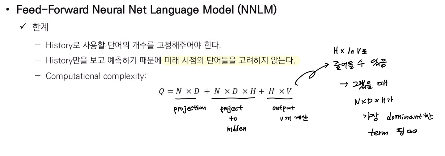 NNLM은 feedforward 방식으로 projection layer( = LookUp Table ) 사용합니다. 하지만 중심 단어 등장 이전의 단어들만으로 단어를 계산한다는 단점이 있습니다.