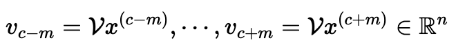 위 그림에서 문맥 단어는 2m개가 있으며, 각 문맥 단어는 c-j 번째 index가 1인 one-hot vector로 나타낼 수 있습니다.