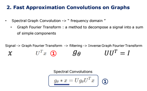 먼저 signal x에 푸리에 변환을 적용해 signal, 여기서는 node의 특징들을 분리를 한 뒤, filter g_theta을 통해 원하는 정보만을 걸러낼 수 있습니다. Inverse를 통해 frequency domain으로 바꾼 그래프를 다시 원래의 domain으로 바꾸는 과정까지 거치면 Spectral convolution을 정의할 수 있게 됩니다.
