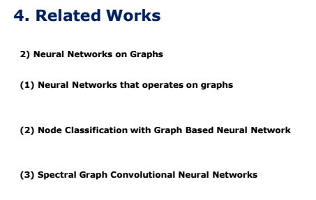 다음으론, 그래프에 Neural Network를 적용한 연구들을 크게 세 분야로 나눠서 설명합니다. GNN과 GNN을 활용한 Node Classification, Spectral GNN에 대한 이전 연구들에 대해 언급합니다.