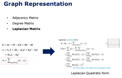 따라서 단순히 L와 graph signal f를 곱하는 대신 f를 두 번 곱해 제곱 형태로 만들면, 그 값이 작을수록 neighbor node와 유사하다는 의미를 갖게 됩니다. 이 형태를 Laplacian Quadratic form이라고 합니다.