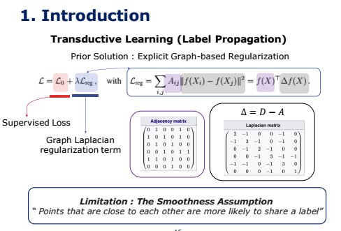 먼저 Graph 기반의 Semi-supervised Learning로, Introduction에서 기존 연구로 함께 살펴 보았던 Graph Laplacian Regularization에 대한 연구들을 언급합니다. 또한 앞에서 말씀드렸던 것처럼 라플라시안 행렬과 같은 Matrix의 표현의 한계로 인해 Graph Embedding Model 등장했다는 흐름 또한 나옵니다.