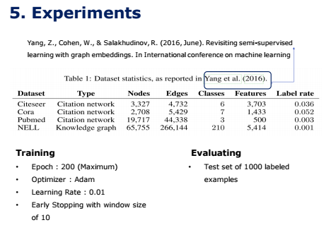 최종적으로 논문에서는 2-layer GCN Z을 사용했으며, 두번째 layer에서는 classification을 위해 softmax를 사용했습니다. 저자는 이 모델에서 data X가 가지고 있지 않은 정보를 인접행렬 A가 가지고 있을 때 더 강력할 것이라 기대한다고 말했습니다.