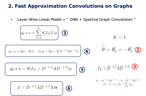 2.2절에서는 2.1의 spectral graph convolution을 딥 러닝에 접목시키는 아이디어를 소개합니다. 딥 러닝의 뉴럴 네트워크 모델은 대부분 여러 개의 선형의 convolution 레이어를 쌓아서 만들지만 파란색 3번은 다항식이기 이러한 구조에 적합하지 않습니다. 따라서 이를 선형 모델로 만들기 위해서 논문에서는 위 식에서 K=1을 적용하여 선형 convolution 필터가 되고, 이 레이어를 여러 번 쌓는 구조를 생각했습니다.