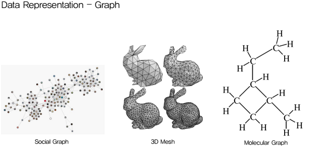 => social graph, 3D mesh, molecular Graph 등 다양한 데이터 또한 그래프의 형태로 나타낼 수 있다!