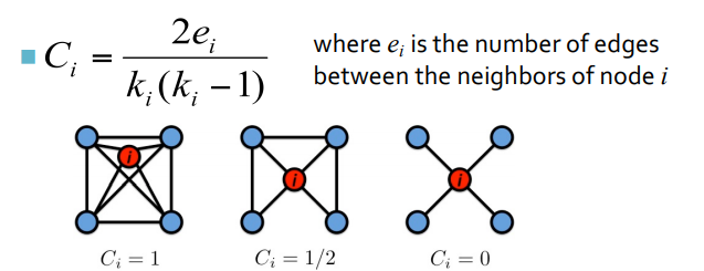 : 어떤 노드 i에 대해 얼마나 이 노드와 연결된 노드들끼리 잘 연결돼 있는가를 나타낸 지수