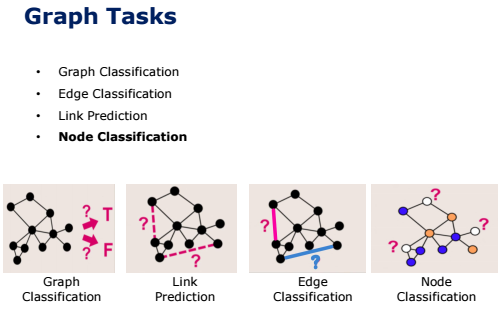 1) Node Classification : “주어진 node”가 어느 속성에 속할 것인지 구분하는 task