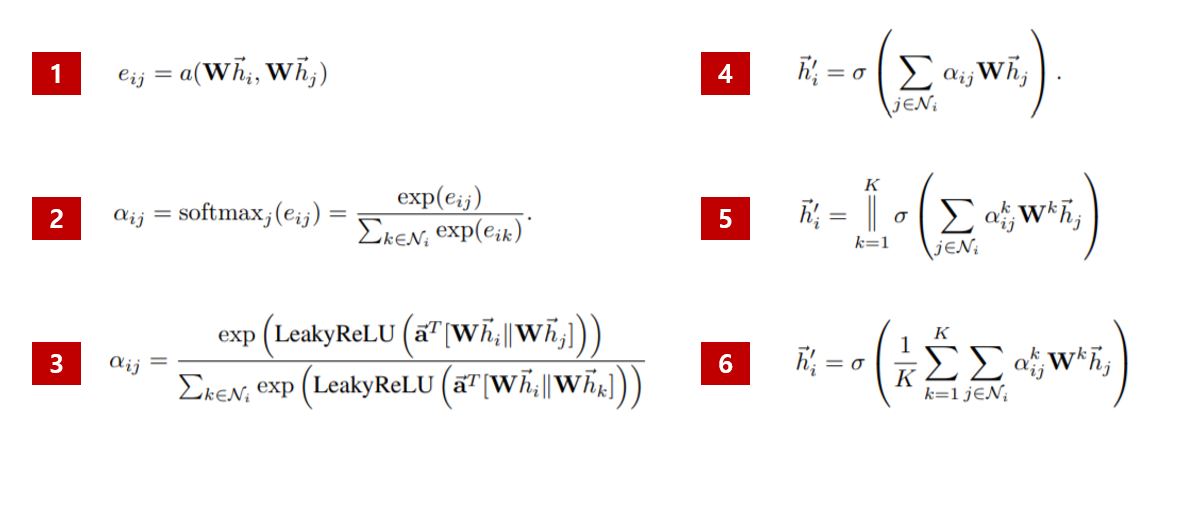 F 개 피쳐의 h는 주변 노드들의 (attention * F’) 들의 합인 h’로 재정의 된다.Expression 5.