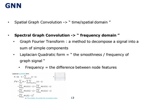 이를 노드 간 message passing이라 합니다. 즉, 한 노드의 정보는 여러 노드의 signal이 혼재해 있는 것으로, 이를 time domain이 아닌 frequency 도메인으로 분석한다면, 한 노드 내에 혼재된 signal들을 여러 signal의 요소로 나눠서 node의 특징을 더 잘 추출할 수 있습니다. 이것에 관한 것이 바로 “Spectral Graph Convolution”입니다. 즉, signal을 노드의 feature라고 봤을 때, 한 노드 내에 혼재된 signal들을 여러 signal의 요소로 나눠서 node의 특징들을 더 잘 추출할 수 있습니다. 이를 수행할 수 있는 대표적인 방법이 푸리에 변환입니다.https://asidefine.tistory.com/159