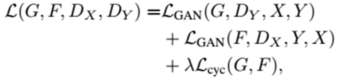 이 Adversarial Loss와 Cycle Consistency Loss를 모두 반영하여 CycleGAN의 목적함수를 이용하게 됩니다.