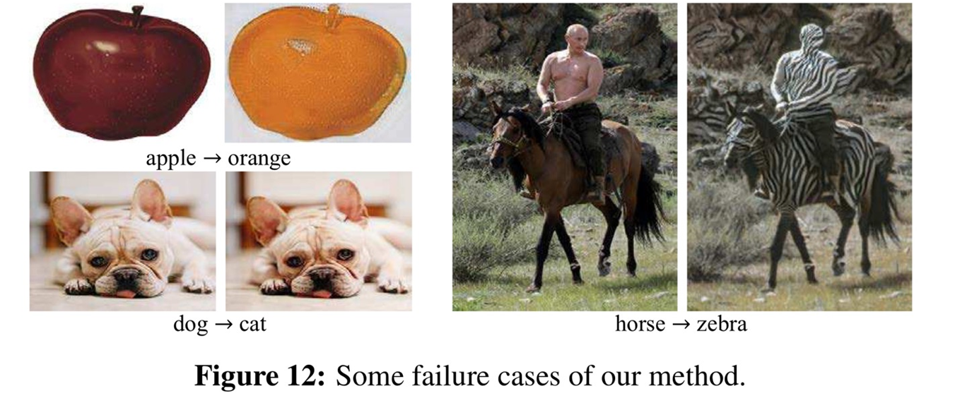 첫번째로, CycleGAN의 경우 색상이나 질감을 바꾸는 task에서는 잘 적용되지만, 객체의 모양 자체를 바꾸는 task에 대해서는 잘 작동하지 않습니다. 오른쪽의 그림에서 보이는 것처럼, 사과를 오렌지로 바꿀 때도 색깔만 바뀌고 모양이 바뀌지 않는다든가, 강아지를 고양이로 바꾸는 작업에 대해서도 그다지 좋은 결과가 나오지 않습니다. 이렇게 모양 자체를 잘 바꾸지 못하는 이유는 생성 모델 자체가 여러 장의 데이터를 학습해서 분위기만 바꾸는 데에 초점을 맞추기 때문이라고 합니다.