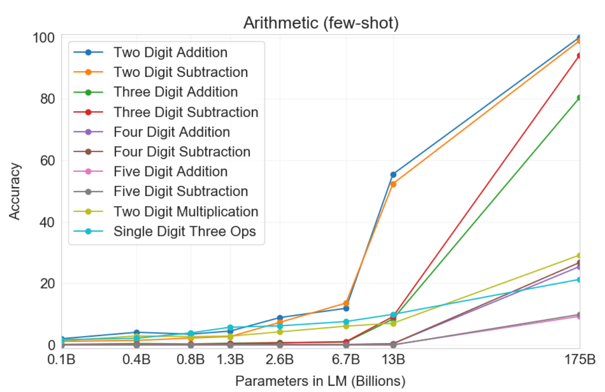Fine-tuning없이 간단한 수학계산을 하는 task에서 GPT-3는 주목할만한 성능을 보였다.