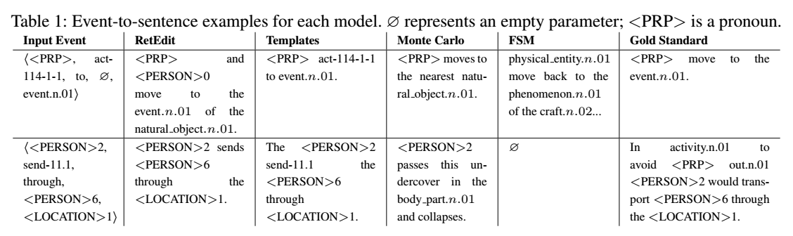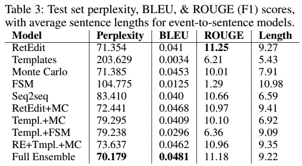 - sentence templating 모델을 Monte Carlo 방식보다 먼저 함으로써, 사건의 의미론적 의미를 유지하는 목표에 암묵적으로 더 큰 중요성을 둔다.
