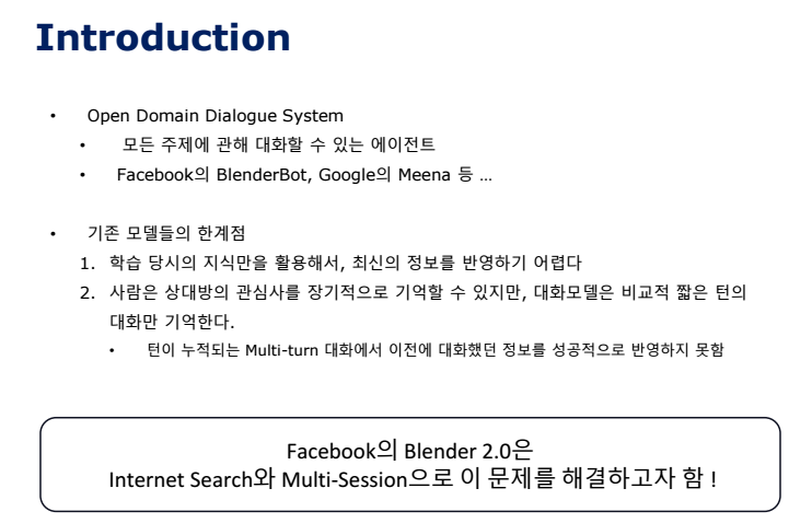 이 blender bot 2.0에 관련된 논문은 두 가지가 있는데요. 위의 Internet-Augmented Dialogue Generation 논문은 인터넷의 있는 정보를 검색해서 최신 정보에 관한 대화도 가능하도록 하는 retrieval-augmented generative models 부분에 집중해서 서술되었고, 오늘 같이 볼 Beyond Goldfish Memory: Long-Term Open-Domain Conversation 논문은 여러 세션에 걸쳐 일관된 대화를 수행할 수 있도록 Long Term Memory based Model을 어떻게 사용하는지에 대해 중점을 두고 서술했습니다.