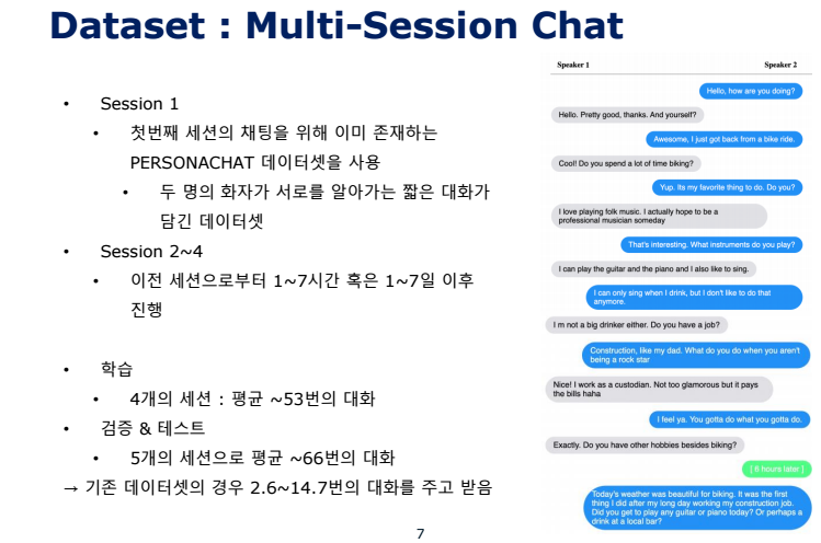 각 세션의 특징을 살펴보자면, 먼저 대화가 처음 시작되는 순간인 Session 1에서는 두 명의 화자가 서로를 알아가는 짧은 대화가 담긴 데이터셋은 PERSONACHAT을 사용했다고 합니다. 다음으로 세션 2에서 4까지는 이전 세션으로부터 1~7시간 혹은 1~7일 이후 진행했다고 합니다.