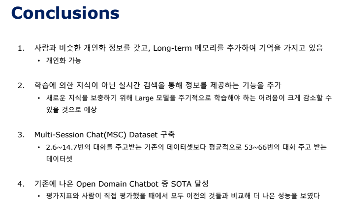 또한 Multi-Session Chat(MSC) Dataset 구축하여 기존의 데이터셋보다 더 길고 풍부한 대화로 이뤄져 있으며, 모델 자체도 정량적인 평가지표와 Human Evaluation면에서 모두 기존에 나온 Open Domain Chatbot보다 더 나은 성능을 보인 것을 알 수 있습니다.