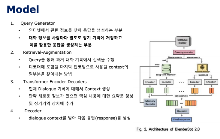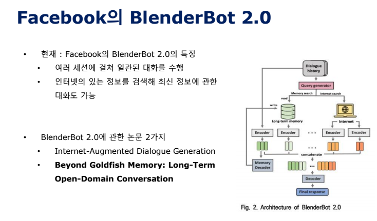 그래서 그 다음 2021년에 나온 Blender Bot 2.0은 이 한계를 개선하여 여러 세션에 걸쳐 일관된 대화를 수행하며, 인터넷의 있는 정보를 검색해 최신 정보에 관한 대화도 가능합니다.