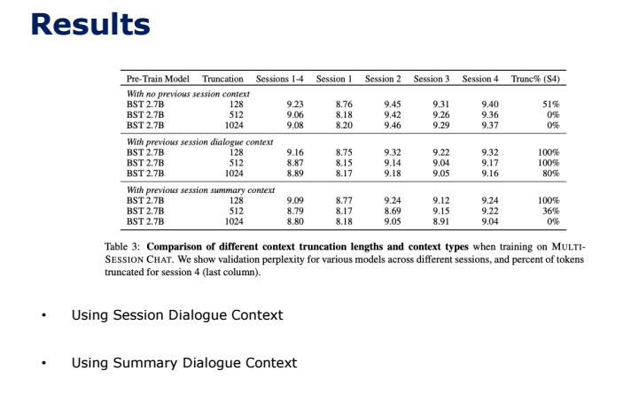 이런 모델을 가지고 실험을 한 결과, 논문에서는 세션 1-4를 평가하면서 context 타입에 따른 차이를 비교했습니다. 첫번째 세션이 끝나고, 이전 세션에 대한 기록(dialogue context) 전체가 주어졌을 때 모든 실험에 대해 perplexity 성능의 향상이 있음을 보였습니다. 이를 통해 MSC 데이터셋에서 context history가 유효하고, 모델이 이를 활용하여 잘 학습하고 있음을 입증했습니다. 또한 대화 자체를 활용하는 것이 아니라 Summary context를 사용했을 때 더욱 성능이 증가했기에 더 유익한 정보를 제공함을 입증했습니다.