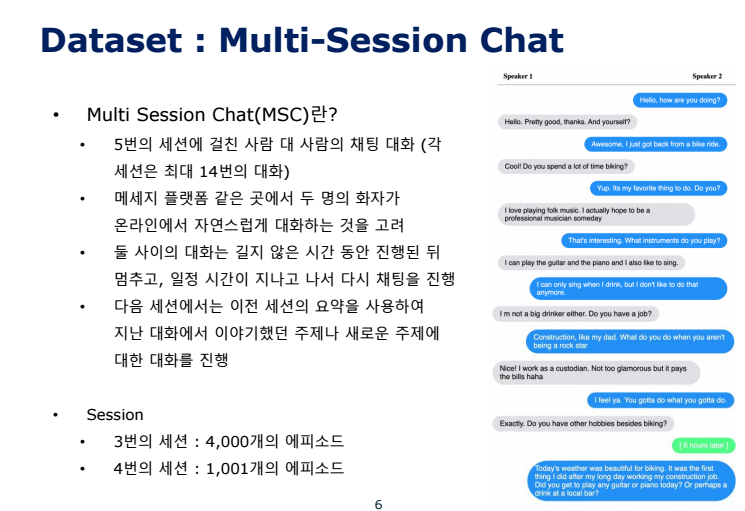 이 Task를 진행하기 위해 Facebook에서는 Multi Session Chat이라는 Dataset을 새로 구축했습니다. Multi Session Chat이란 5번의 세션에 걸친 사람 대 사람의 채팅 대화로, 각 세션은 최대 14번의 대화로 구성되어 있습니다. 메세지 플랫폼 같은 곳에서 두 명의 화자가 온라인에서 자연스럽게 대화하는 것을 고려하였고, 둘 사이의 대화는 길지 않은 시간 동안 진행된 뒤 멈추고, 일정 시간이 지나고 나서 다시 채팅을 진행했습니다. 제가 옆에 가져온 예시에서는 6시간 뒤에 새로운 세션의 대화를 시작한 것을 알 수 있습니다. 또 이 새로운 세션의 대화를 시작할 때는 이전 세션의 요약을 사용하여 지난 대화에서 이야기했던 주제나 새로운 주제에 대한 대화를 진행했다고 합니다. 이렇게 해서 세션은 3개나 4개로 이뤄질 수 있도록 구성했습니다.