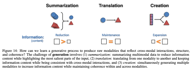 (4) Generation involves learning a generative process to produce raw modalities that reflect cross-modal interactions, structure, and coherence.