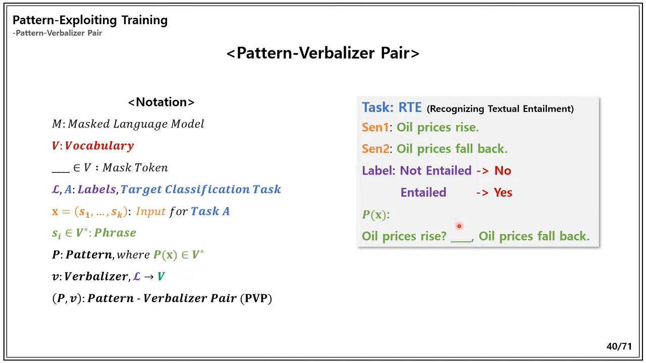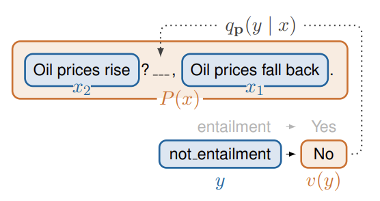 - 이제 빈칸에 들어가야 할 정답은 'not entailment'가 되어야 하는데, 빈칸은 하나이기 때문에 이 정답을 하나의 토큰으로 표현해주는 verbalizer v가 필요하다.