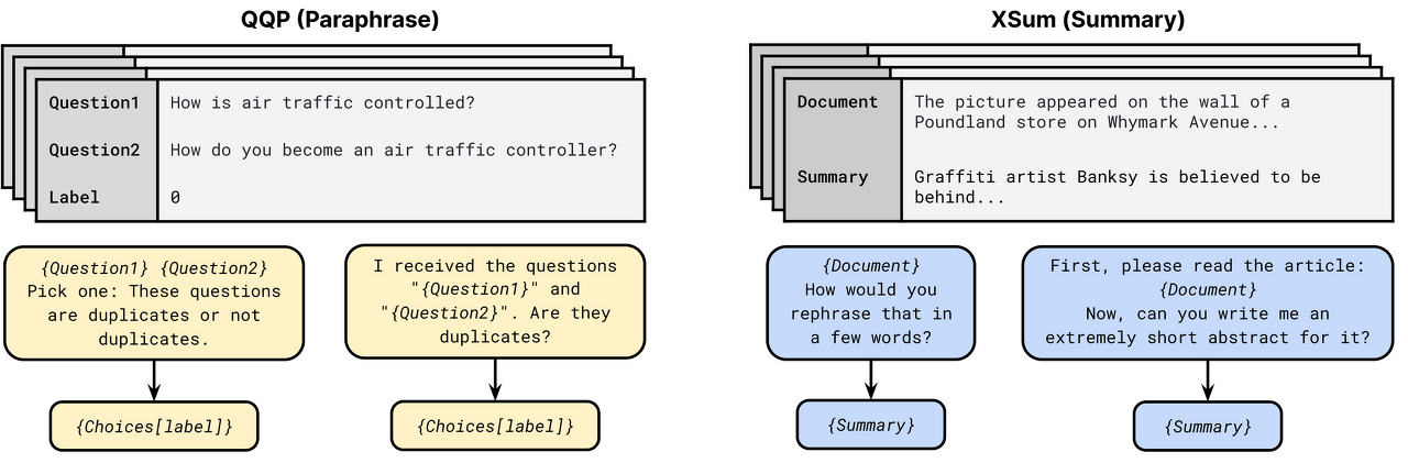 P3 프롬프트 모음의 프롬프트 템플릿. 각 작업에 대해 여러 가지 템플릿 이용이 가능합니다. 각 템플릿은 입력 패턴과 타깃 언어 처리기로 구성됩니다. 패러프레이징 작업의 경우 첫 번째와 두 번째 템플릿에서 Choices는 각각 {Not duplicates, Duplicates}과 {Yes, No}로 구성됩니다(Sanh et al., 2021).