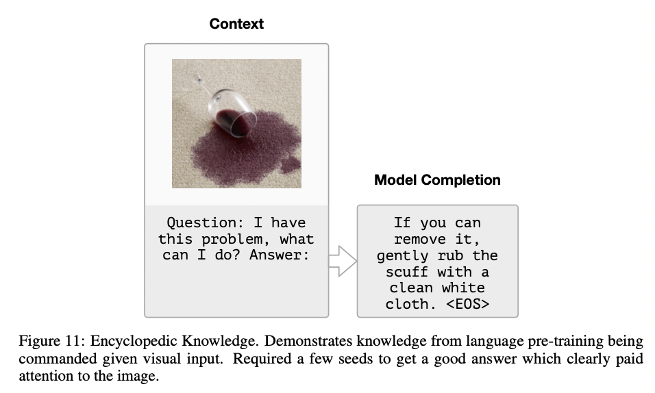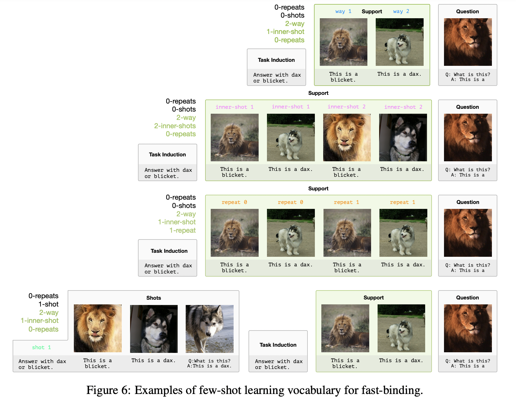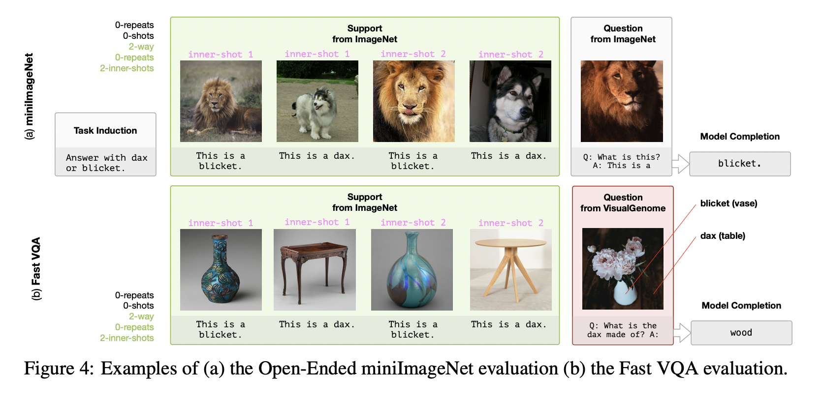 - 이를 통해, 새로운 멀티모달 태스크의 몇 가지 예를 prompt하거나, 새로운 visual category의 이름을 묻기 직전에 가르치고 바로 적절하게 대답할 수 있도록 한다 (fast concept binding).