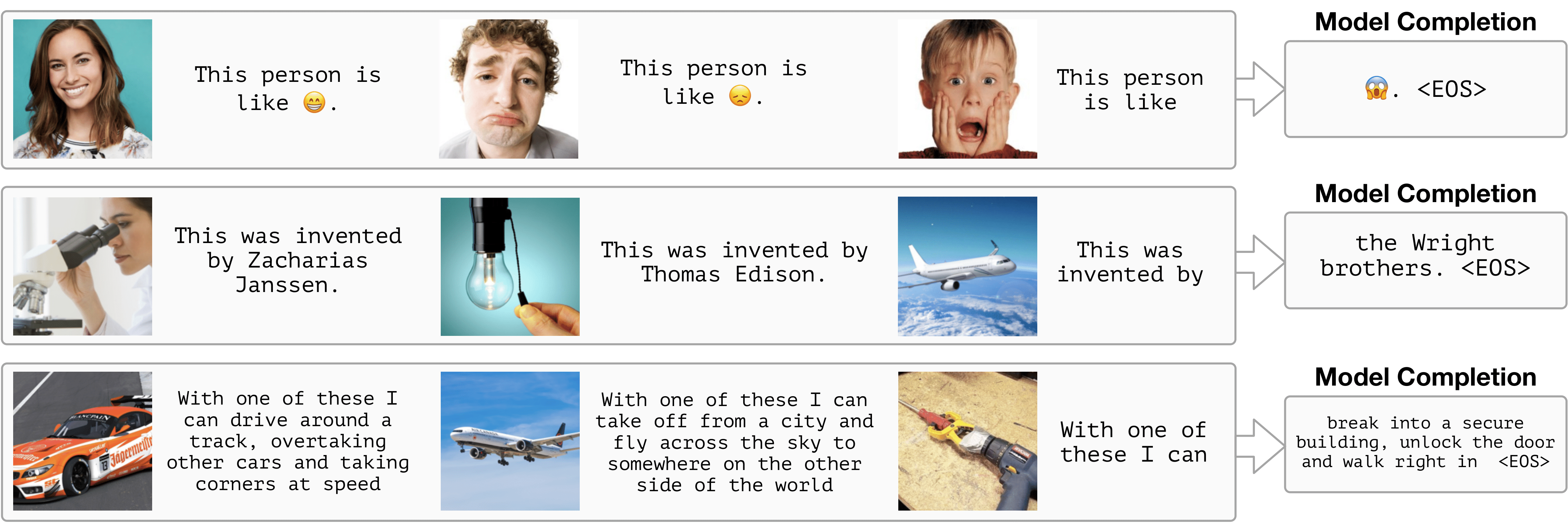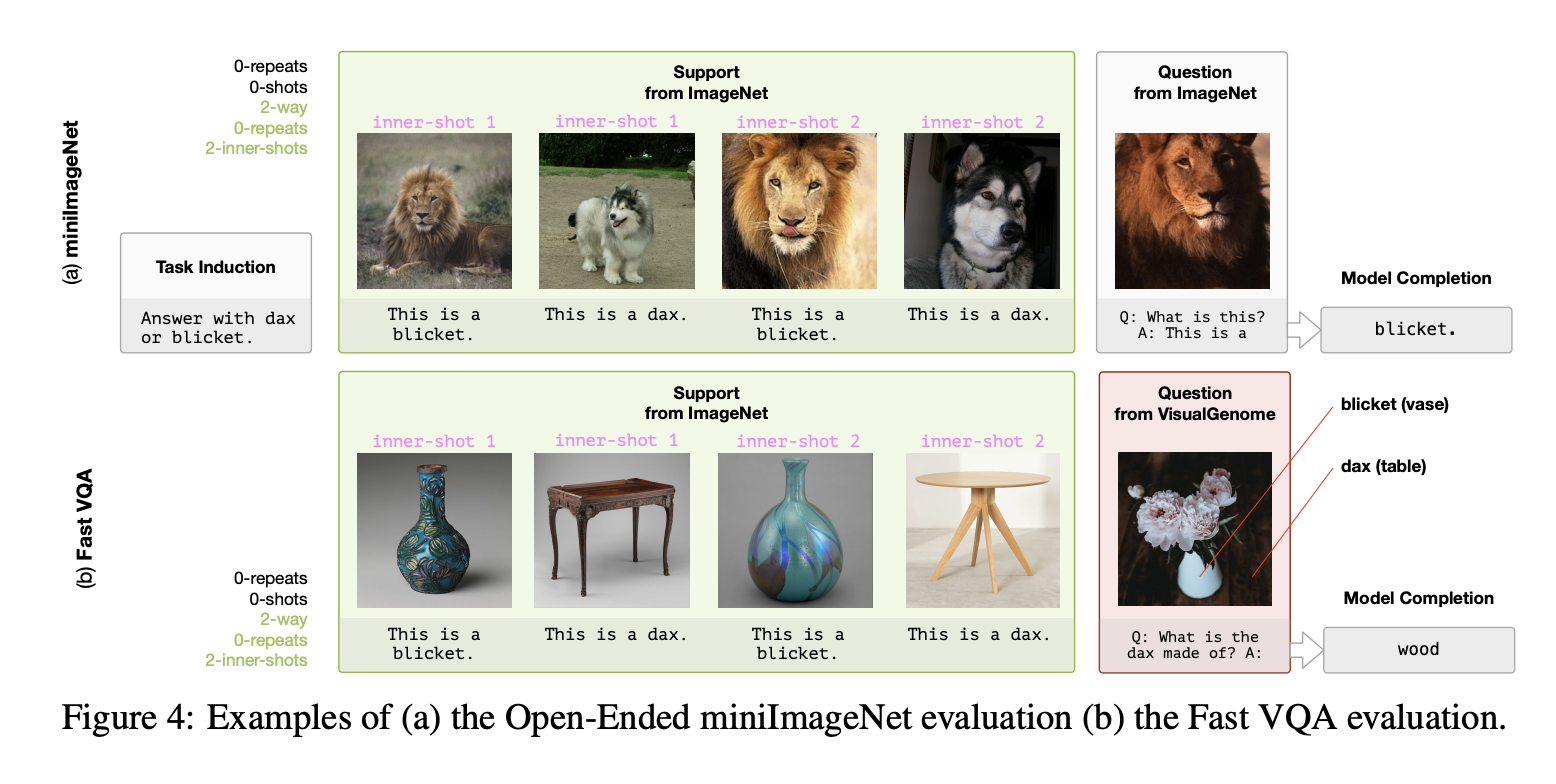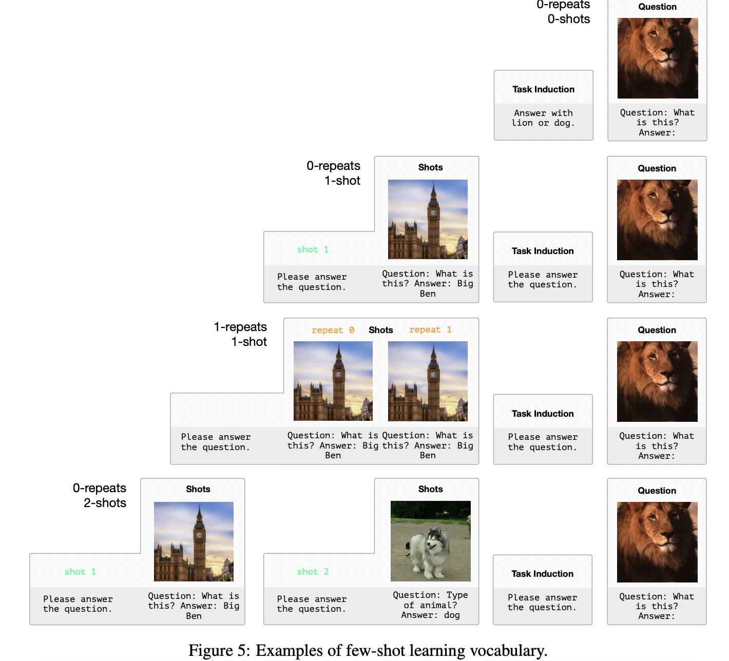 - 이를 통해, 새로운 멀티모달 태스크의 몇 가지 예를 prompt하거나, 새로운 visual category의 이름을 묻기 직전에 가르치고 바로 적절하게 대답할 수 있도록 한다 (fast concept binding).