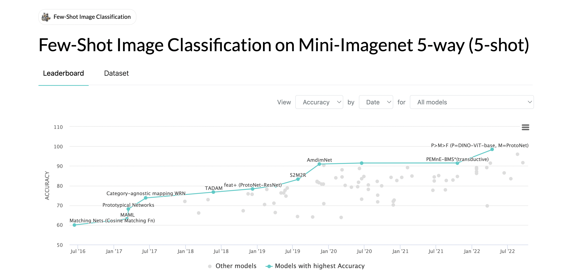 https://paperswithcode.com/sota/few-shot-image-classification-on-mini-3 - 사용 데이터셋 : minImageNet meta-learning task