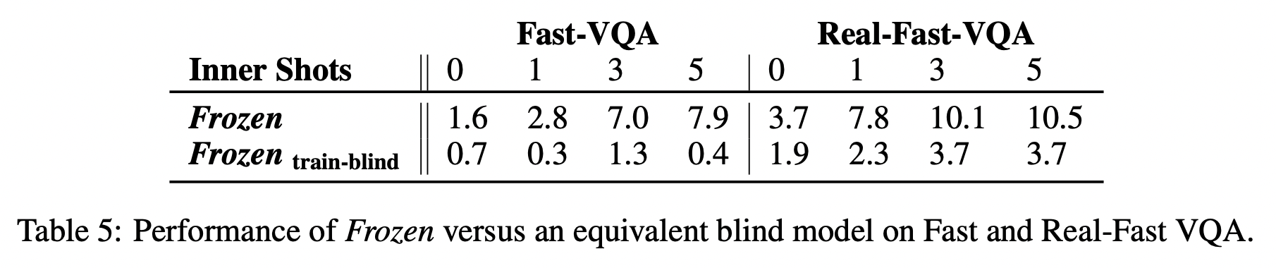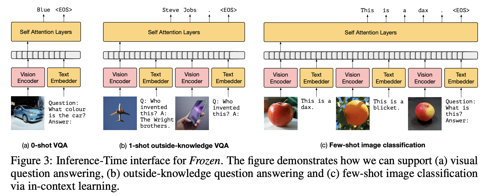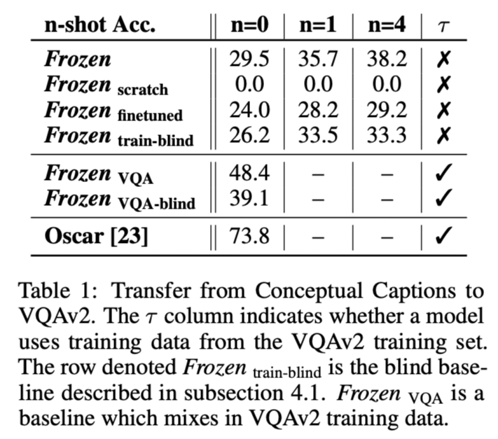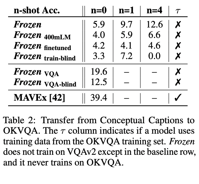 - Frozen은 단일 이미지-텍스트 쌍에 대해 훈련하지만, 훈련 후에는 여러 이미지와 단어의 align된 set에 효과적으로 대응할 수 있다