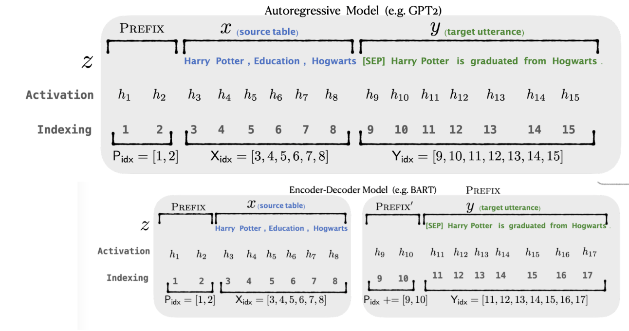 자연어 생성에서 인코더와 인코더 모두에 대한 Prefix를 추가하여 z = [prefix; x; prefix'; y]로 입력을 준다.